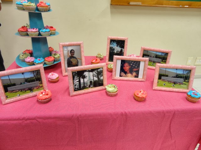Como fizemos com o convite, queríamos que nossa decoração representasse a organização das moças. Encontramos porta-retratos (num valor bem em conta) com molduras das cores dos valores das moças. Porém, no dia em que fomos compra-los, só tinha na cor rosa disponível. Nossa ideia era representar as cores dos valores das moças, como não pudemos fazer isso com os porta-retratos, fizemos com os cupcakes. O Resultado foi esse.